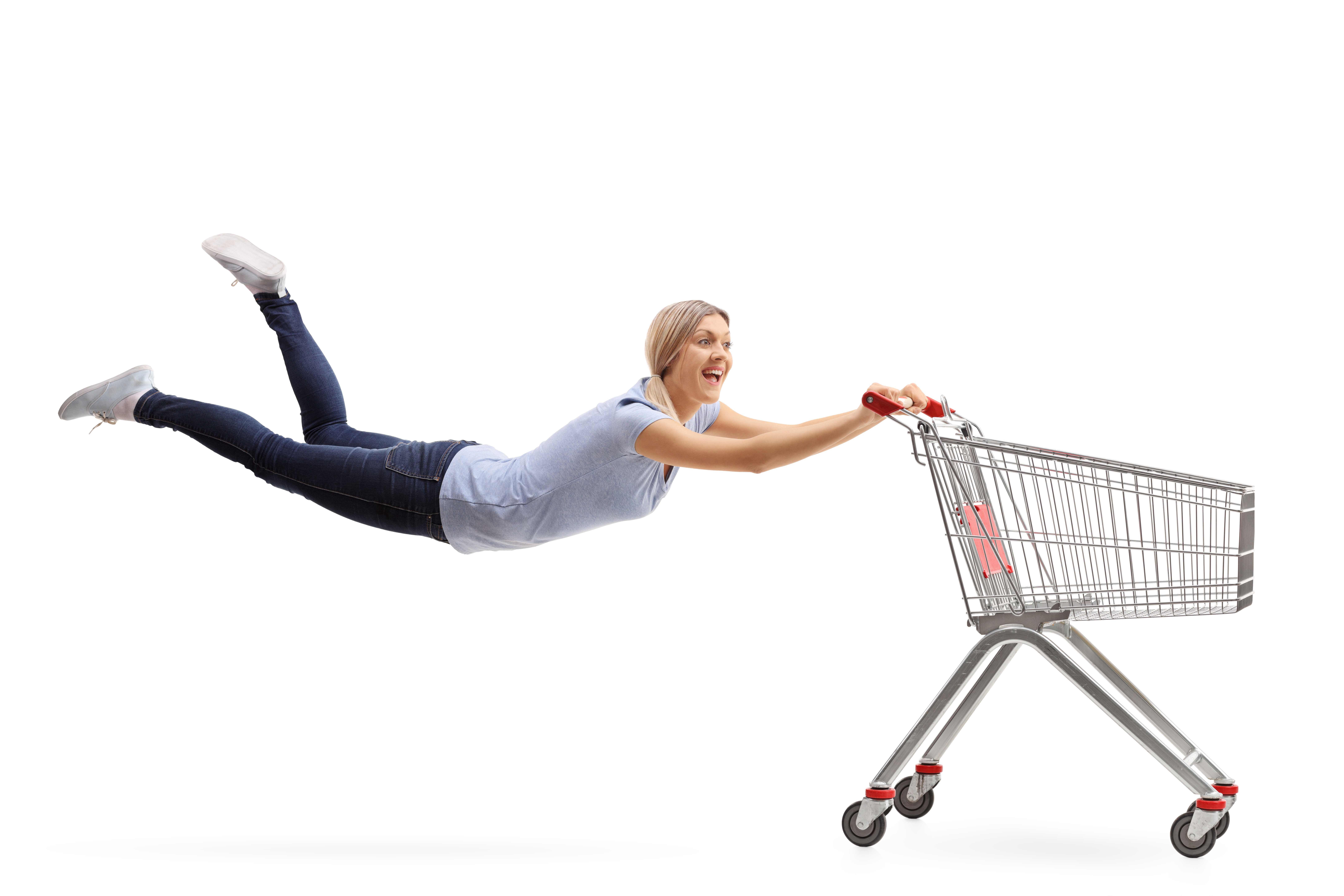 Shopping basket with computer device and accessories, 3D rendering isolated on white background