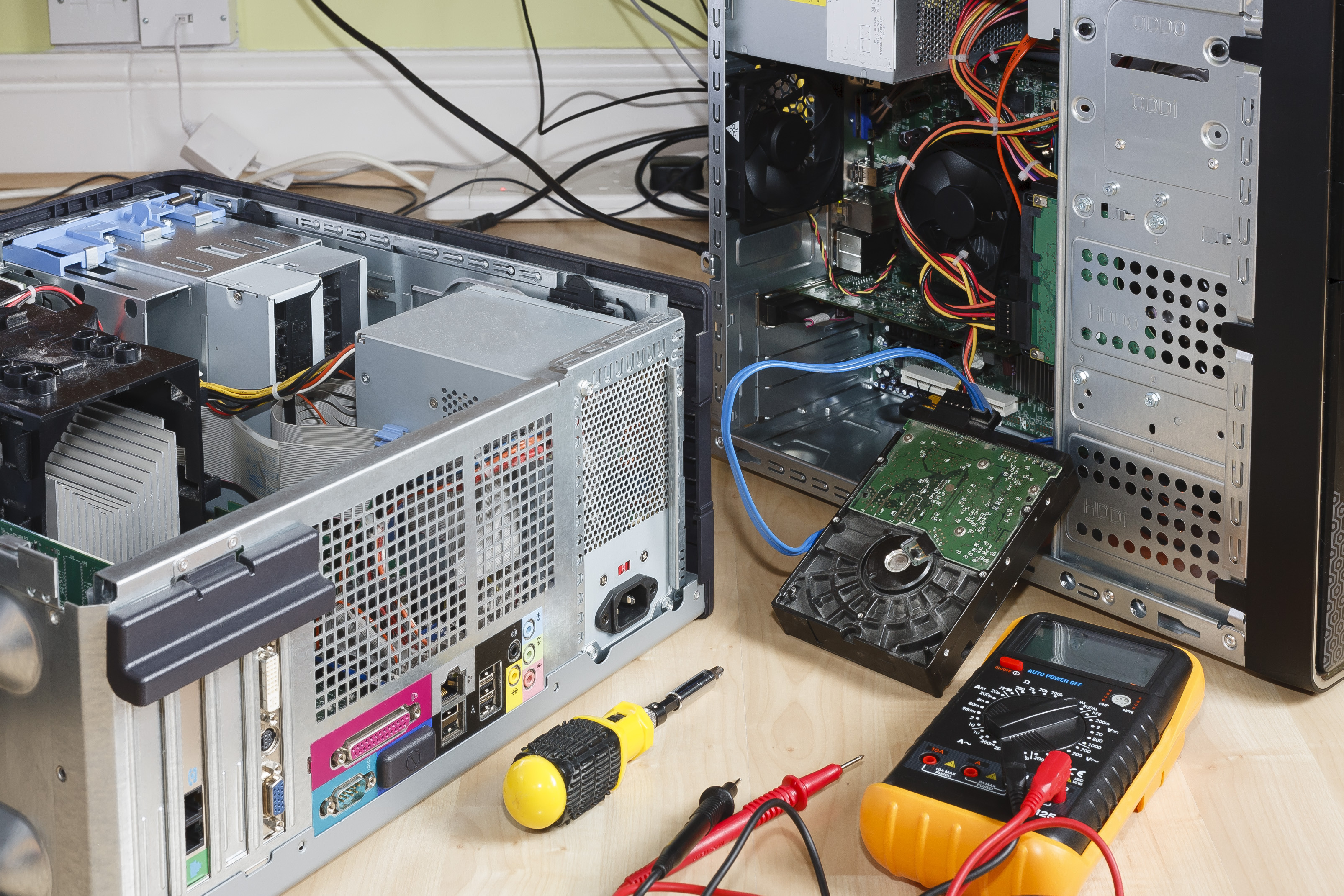 Open tower PC computers. Depicts computer repair, maintenance, service or upgrade